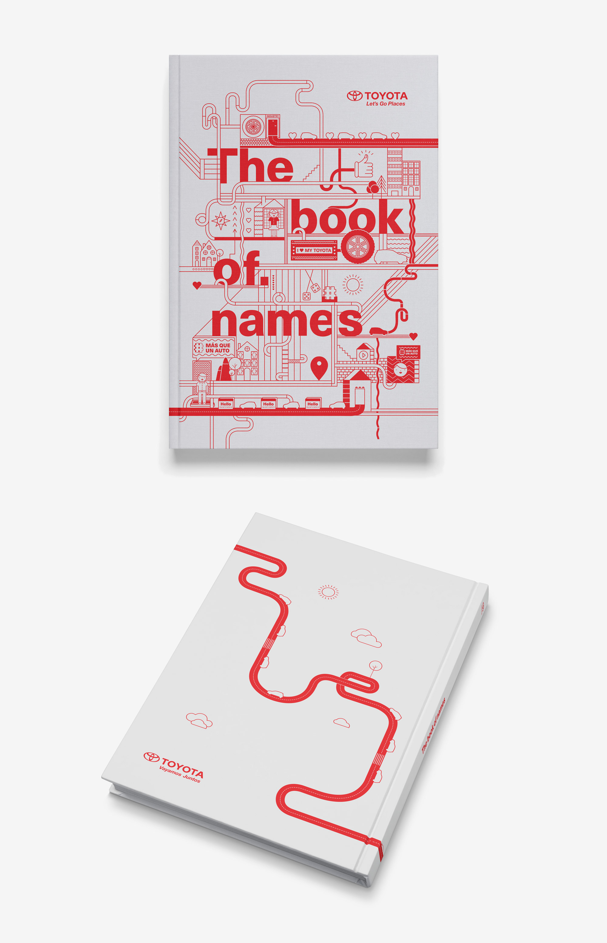 In continuation of Toyota's "Más que un Auto" campaign, which awarded owners personalized badges, we developed "The Book of Names." This book illustrates the stories behind these named vehicles and was launched in Los Angeles with immersive installations for select stories. It's a limited-edition, hardcover tribute to Toyota's Hispanic American customers, inviting them to explore and share their car-naming experiences.